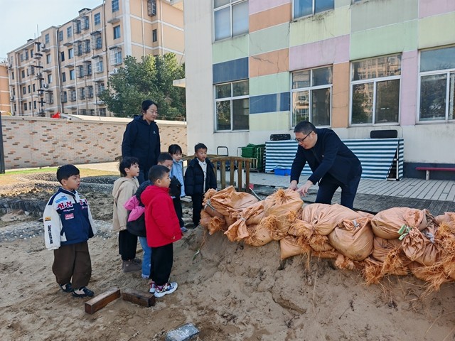 课程延伸至户外沙池。孩子们邀请甘站长现场指导他们搭建的堤坝模型。甘站长俯身示范,讲解筑坝材料的特性,将课程内容转化为可操作的实践,实现了“在游戏中学习”的教育目标。