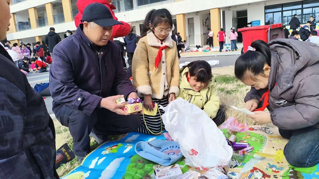 另一边的学生跳蚤市场同样人头攒动。老同志们穿梭在各个摊位之间,或驻足欣赏孩子们精心摆放的书籍、文具与手工艺品,或化身“顾客”与小摊主讨价还价,用实际行动支持孩子们的实践体验。他们还不忘引导小摊主们文明交易、礼貌待客,鼓励大家学会分享与节约,让跳蚤市场不仅充满趣味,更饱含教育意义。