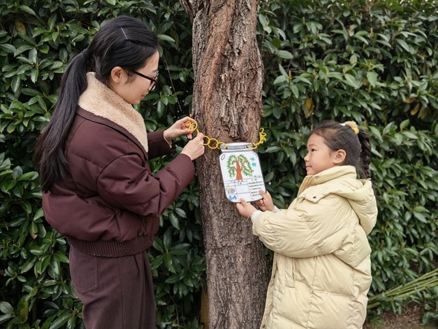 种植结束,关工委组织的家长志愿者与孩子们开展“护绿行动”。大家为小树挂上自制树牌,孩子们用稚嫩笔触写下祝福。在“春日相框”环节,志愿者协助孩子们采集落花嫩叶,用创意封存春天色彩,让环保理念浸润童心。