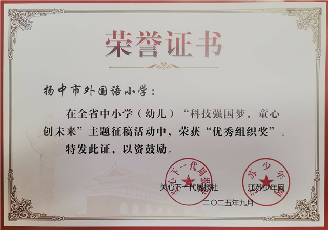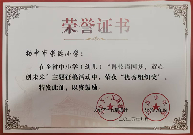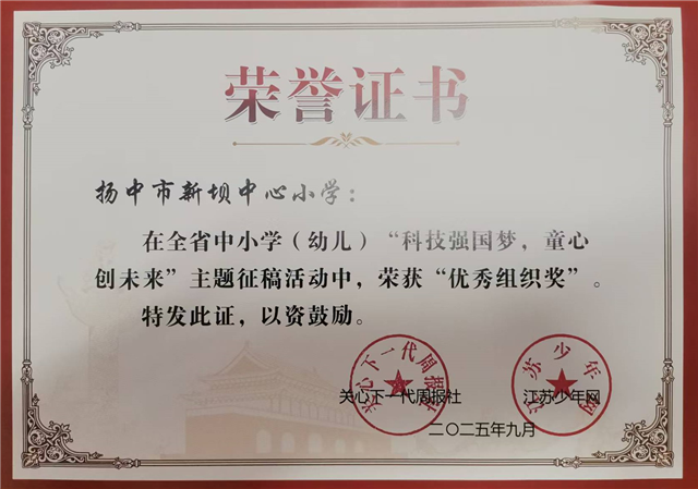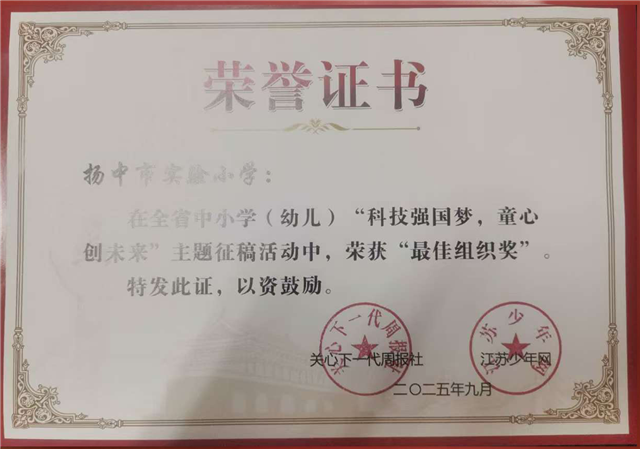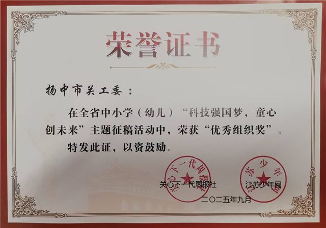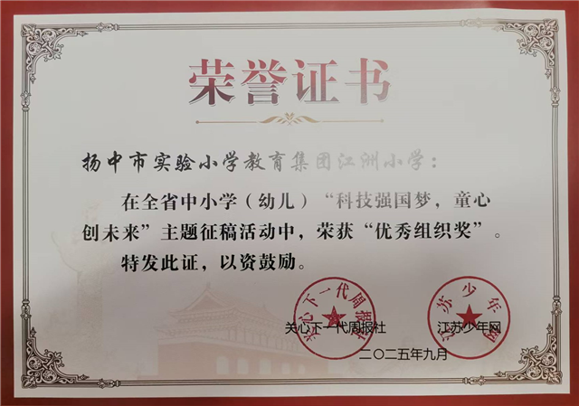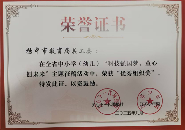 (2025年9月23日朱华庆报道)在《关心下一代周报社》、江苏少年网联合举办的“科技强国梦,童心创未来”主题征稿活动中,我市成绩喜人。扬中市关工委、教育局关工委两个单位和新坝中心小学、江洲小学、崇德小学、外国语小学4所学校荣获优秀组织奖,扬中市实验小学荣获最佳组织奖。
