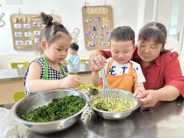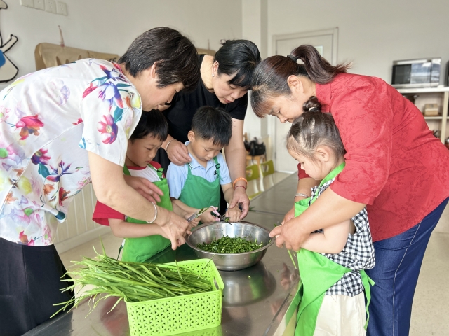 宝贝们学着奶奶的动作做蛋糊、剪韭菜花,专注的动手操作与体验。关工委陈奶奶握着孩子的小手搅拌蛋液,“左三圈、右三圈”,搅蛋器在祖孙手中飞舞着,蛋花、韭菜花融成了最美的颜色。关工委老同志们将生活智慧融入劳动教育,在锅碗瓢盆的叮咚声中传递着“一粥一饭”的珍惜之情,更延续了“五老以鲜活方式浸润文化传承”的关工精神。