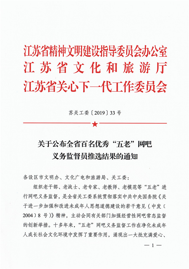 省关工委印发“苏关工委【2019】33号”《关于公布全省百名优秀“五老”网吧义务监督员推选结果的通知》,我市网吧义务监督员、原市教育局党委书记郭道杰同志荣获“全省百名优秀‘五老’网吧义务监督员”称号。2002年以来,郭老退休不退岗,兢兢业业做好网吧义务监督工作,在净化未成年人成长社会文化环境中发挥了重要作用,受到了社会各界的一致好评。