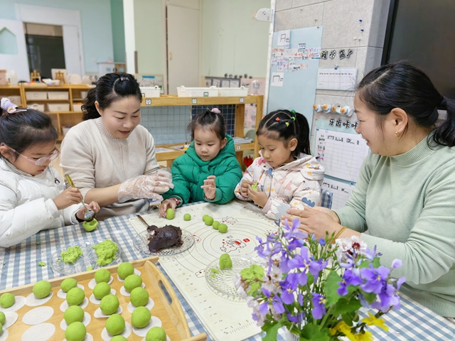 巧手做青团将活动推向高潮。奶奶们手把手教孩子揉面、包馅、搓圆,一颗颗碧绿的青团在稚嫩小手中诞生。春日香气在指尖萦绕,传统食俗在欢声笑语中代代传承。