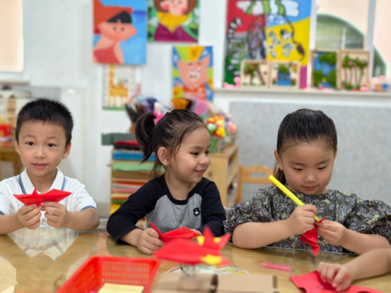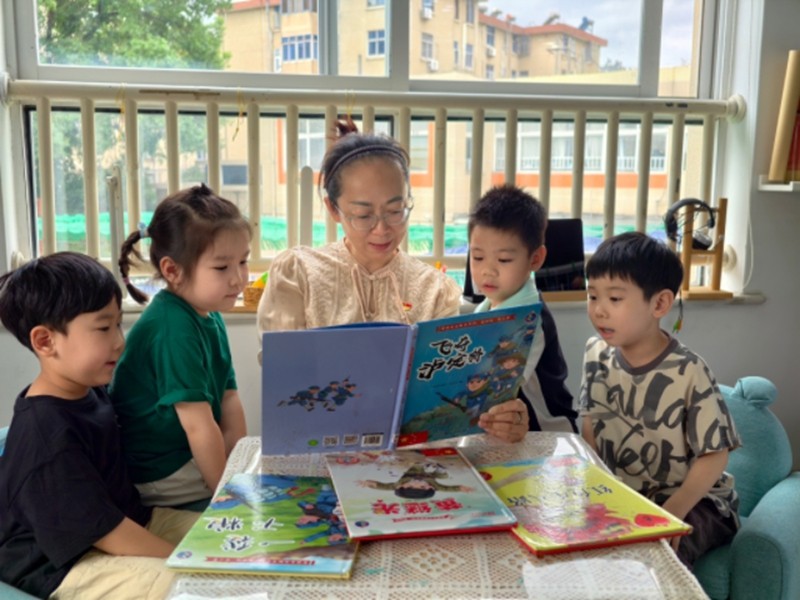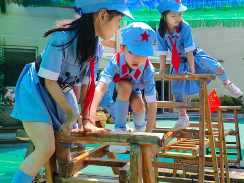 老教师带领孩子们阅读经典红色绘本故事《飞夺泸定桥》,深刻认识和感受了革命先辈们在艰难困苦中展现出的非凡勇气和独特智慧,更加珍惜来之不易的幸福生活;户外场地上,孩子们参与“穿越火线”“运军粮”等野战趣味游戏,齐心协力克服各类“障碍”,领悟勇气的可贵与团结的力量;区域游戏时,孩子们围坐在一起,剪剪贴贴、涂涂画画,将对英雄的敬意、对和平的期盼,融入一件件红色主题手工中。