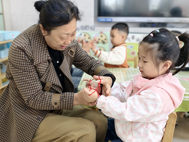 本次活动精心设置了多项富有温度的环节。关工委的爷爷奶奶们亲临现场,为孩子们讲述重阳节的渊源与习俗,手把手地教导他们“传统梳头礼”,更在“翻花绳”、“老鹰捉小鸡”等祖辈童年游戏中与孩子们欢乐互动。老少携手,其乐融融,尊老爱老的中华美德在这场跨越岁月的对话中,自然而然地浸润了童心。