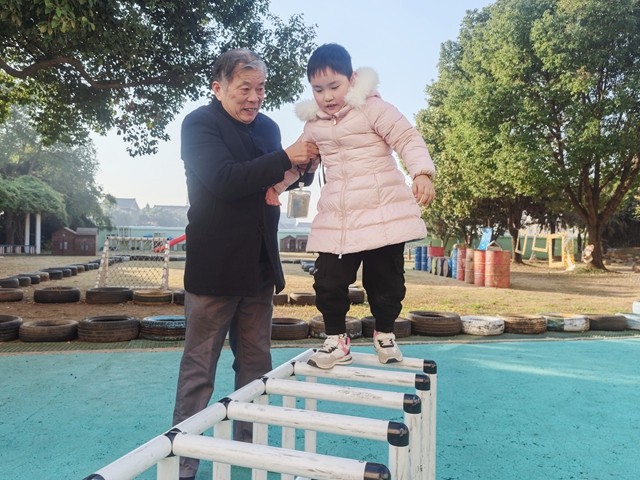 在户外游戏区,白发苍苍的爷爷小心翼翼地搀扶着孩子跨越体能障碍,每一次鼓励的眼神、每一次稳稳的托扶,都传递着隔代的关怀。轮胎阵、体能架在祖孙默契配合下,变成了充满欢乐的成长天地,孩子们在祖辈的守护中大胆探索,锻炼肢体协调能力。