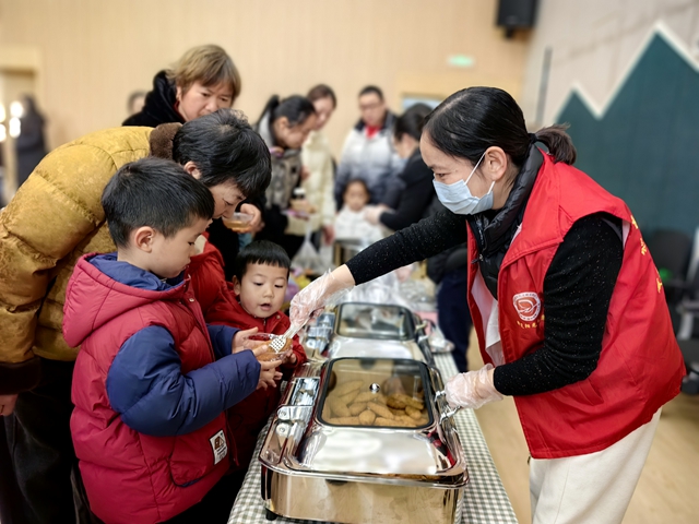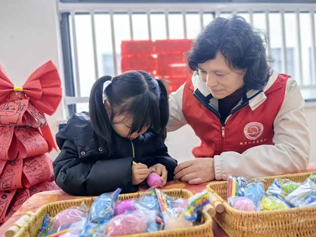 集市当天,老同志们各司其职。“传统文化特色区”内,她们耐心指导孩子体验传统技艺:示范讲解福字书写要领与吉祥内涵,引导孩子写下工整福字;讲解彩蛋色彩搭配与图案寓意,助力孩子描绘心中美好;细致解读民族服饰纹样,带领孩子缝制灵动民族娃娃。“美食分享区”里,老同志们备好安全健康的节日美食,引导孩子有序取餐、文明分享,培养良好习惯与社交礼仪。此外,部分老同志化身“安全观察员”巡逻提醒,保障活动有序安全;另有担任“环境大使”,引导垃圾分类,传递绿色环保理念,让文明素养潜移默化扎根。