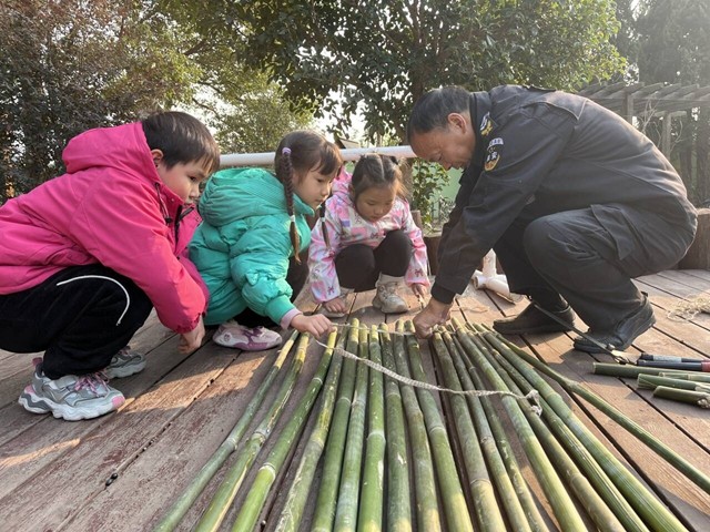 “爷爷,这些竹子要怎么系才不会松呀?”冬日暖阳下,幼儿园的户外木台上传来阵阵稚嫩的提问。1 月 12 日,扬中市长旺中心园关工委的钱爷爷给大班孩子带来了一场别开生面的“绑竹小课堂”。