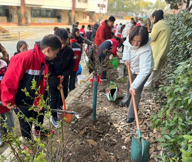 3月12日植树节当天,扬中市江洲小学关工委老教师与六年级学生一起,在校园里种下造型可爱的棒棒糖花苗。孩子们挥锹挖土、细心栽植,为即将告别的小学时光种下甜蜜印记。