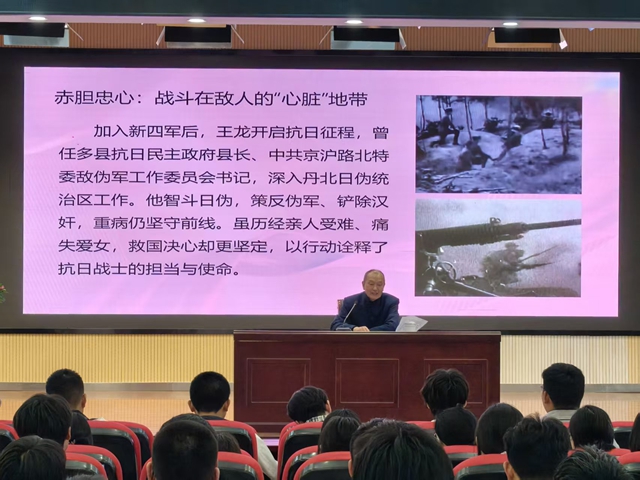 团课上,戴老师以中共首任镇江市市长、扬中籍革命烈士王龙生平为主线,讲述其在民族危亡之际投笔从戎、加入新四军,浴血抗敌、心系百姓,最终壮烈牺牲的感人事迹。王龙烈士的红色家风同样动人:二十多名亲友投身抗日,妻子传承遗志送儿女参军,子女转战南北、报效祖国。英烈精神在血脉中延续,令在场同学深受震撼。
